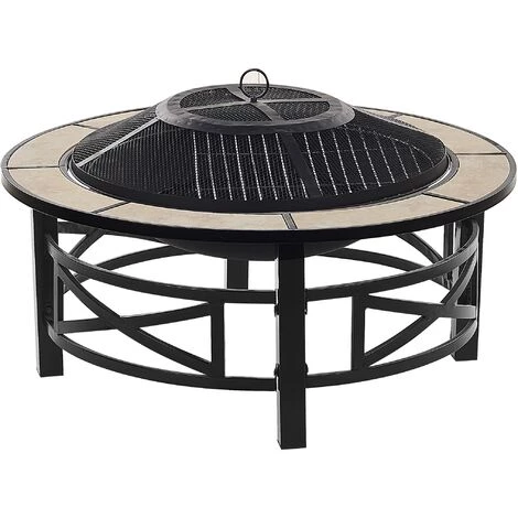 Brasero grill avec fonction barbecue élégant et fonctionnel. Profitez pleinement de vos moments en famille ou entre amis passés dans votre jardin ou sur votre terrasse. Ce magnifique braséro rond vous offre beaucoup plus que la chaleur et un design décoratif qui embellira sans doute votre extérieur. En effet, ce joli braséro 2 en 1 se transforme facilement en outil de cuisson et vous permet d’organiser un vrai barbecue pour tous vos proches. Fait en acier noir durable et résistant aux intempéries, ce braséro grill est orné de carreaux en céramique beige pour rehausser le look de votre terrasse. *Ce braséro design vous est proposé avec ses accessoires indispensables : couvercle de protection anti-étincelles, la grille barbecue, le porte-bûches et le tisonnier