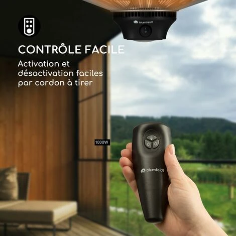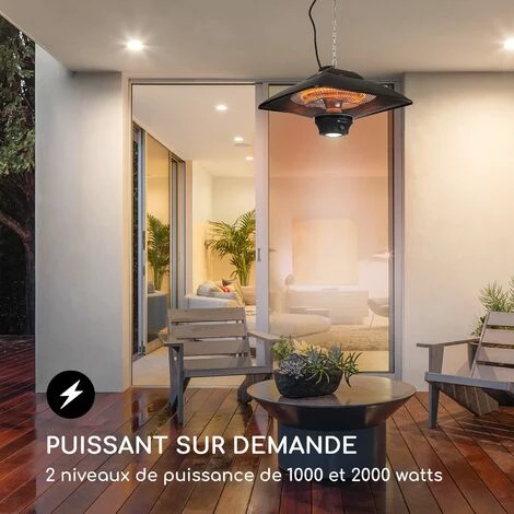 Le chauffage extérieur Heat Square de blumfeldt peut être aisément suspendu au plafond à l’aide d’une chaîne de 50 cm et vous fournit ainsi, à vous et à vos invités, une puissance de chauffage rapide et efficace allant jusqu’à 2 000 watts. Le système IR ComfortHeat impressionne par ses deux éléments chauffants infrarouges au carbone extrêmement durables. Ils fournissent non seulement de la chaleur très rapidement, mais grâce au réflecteur en aluminium très efficace et au rayonnement infrarouge à ondes longues, ils l’émettent spécifiquement vers les personnes et objets à proximité sans réchauffer l’air. Appréciez une chaleur agréable dès la première seconde ! En appuyant sur un bouton, vous pouvez choisir en quelques secondes entre les deux niveaux de chaleur, 1 000 ou 2 000 watts, ce qui vous permet de répondre facilement aux besoins de vos invités. Vous pouvez également aisément contrôler la lampe chauffante à l’aide d’une télécommande. Organisez des dîners sur le balcon ou la terrasse sans vous soucier de la température, car dès qu’ils sont allumés, ils produisent une chaleur agréable, chaleureuse et sûre sans long temps de chauffe. Le chauffage extérieur Heat Square de blumfeldt à infrarouges en aluminium est non seulement robuste mais ajoute une touche de luxe. Une lampe LED intégrée peut être allumée indépendamment et assure un éclairage dans les heures sombres. Pour une utilisation sûre à l’extérieur, le boîtier est étanche aux éclaboussures conformément à l’indice de protection IP24 et peut également être utilisé sans problème lors de soirées humides.