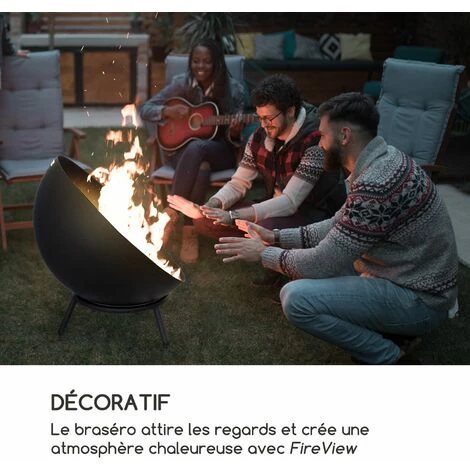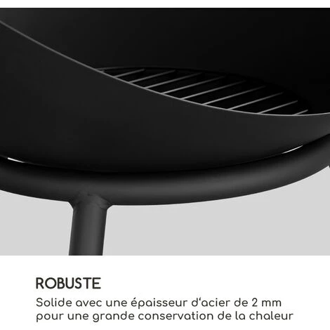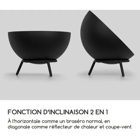 Le point fort du braséro est la variété des utilisations possibles : orientez-le à l’horizontale et allumez un feu de camp traditionnel dans votre jardin ou orientez la demi sphère en diagonale et profitez des flammes dans votre nouvelle cheminée sur la terrasse. Quel que soit l’usage pour lequel vous brûlez, le braséro Blumfeldt vous apporte à domicile détente, confort et une touche de romantisme avec son design emblématique. Le braséro et ses flammes dansantes vous permettent de vous détendre et de vous reposer après une dure journée de travail. De plus, votre feu est protégé du vent par l’utilisation diagonale de la demi-sphère et vous pouvez profiter encore plus de sa chaleur confortable. Même sans vous chauffer, le Blumfeldt Fireball séduit le regard. La cuve noire et la base argentée ont une qualité et une finition de haut niveau. Avec sa paroi en acier de 2 mm d’épaisseur, le braséro est très robuste. Les trois pieds du support l’empêchent de basculer et assurent un maintien sûr dans votre jardin ou sur votre terrasse. La housse de pluie incluse protège votre nouveau braséro préféré du vent et des intempéries. Sa conception ainsi que la grille à cendres assurent une combustion propre et sûre. Si votre charbon de bois ou vos bûches sont à bout de souffle, redonnez-leur un peu d’élan avec le tisonnier inclus.