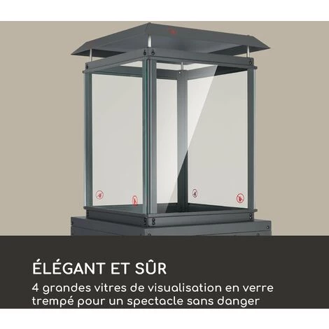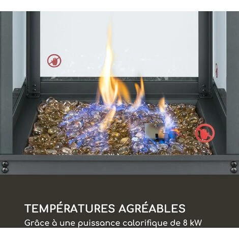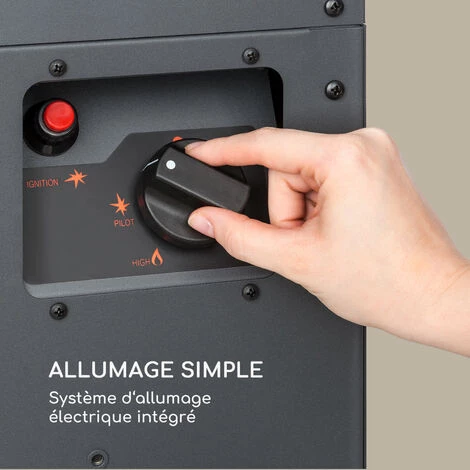 Puissant et économique. Le radiateur à gaz blumfeldt Flagranti utilise des bouteilles de gaz liquide de propane ou de butane pesant 5 ou 11 kg, qui se rangent facilement dans son intérieur spacieux. L’appareil s’allume facilement grâce au système d’allumage électrique intégré. L’alimentation en gaz comprend un régulateur à plusieurs vitesses. Le radiateur à gaz produit une puissance calorifique jusqu’à 8 kW et chauffe rapidement et efficacement les personnes à proximité immédiate de façon agréable et chaleureuse. Au centre se trouve bien sûr une belle flamme visible à travers 4 grandes fenêtres en verre trempé et entourée d’une élégante décoration en pierre pour un spectacle impressionnant et inoffensif. Quatre roulettes de sol facilitent le déplacement du radiateur à gaz blumfeldt Flagranti, tandis que des freins de stationnement fiables assurent la sécurité à tout moment. La structure en acier inoxydable anti corrosion rend l’appareil particulièrement durable et adapté à une utilisation en extérieur. Un fusible intégré interrompt l’alimentation en gaz du brûleur en cas de basculement. De cette manière, il prolonge la saison en extérieur de quelques mois avec un climat confortable.