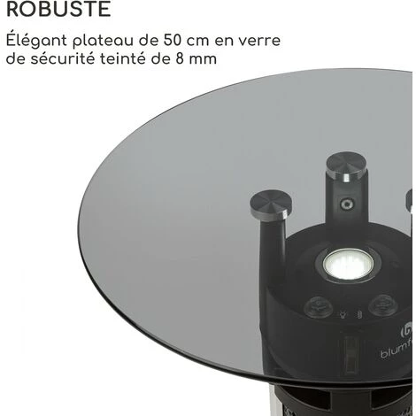 La Blumfeldt Primal Heat 65 est une table de bistro chauffante avec un solide plateau en verre de sécurité et éclairage LED d’ambiance qui transforme littéralement chaque coin salon d’extérieur avec son éclairage et sa chaleur. Le pied de 65 cm de haut de la table de terrasse abrite un élément chauffant infrarouge de 1200 W en carbone pour une chaleur agréable et rapide. Grâce au système IR ComfortHeat, ce n’est pas l’air qui est réchauffé mais directement les personnes et les objets visés. En mode capteur, trois capteurs infrarouge contrôlent le fonctionnement intelligent de l’élément chauffants. Lorsque des personnes ou des objets se trouvent dans un rayon d’environ 60 cm, le radiateur fonctionne à pleine puissance. Si la zone de détection est vide, il passe au contraire en mode économique et fonctionne à puissance réduite. Grâce à sa norme de protection IP 44, la table peut être installée à l’extérieur en toute quiétude.