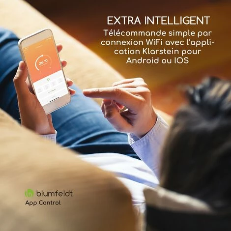 Le chauffage à infrarouge blumfeldt Smartwave est un système ingénieux car il peut être commandé via l’application. Que vous utilisiez des appareils avec Android ou IOS, il vous suffit de télécharger l’application « blumfeldt » et de connecter au WiFi jusqu’à 7 appareils simultanément via la fonction Multicommand, que vous pourrez ensuite commander. Le Smartwave est ainsi un système particulièrement intelligent et peu encombrant pour diffuser de la chaleur sur les terrasses des cafés, dans des ateliers ainsi que dans des grands espaces de travail. La fonction OpenWindow Detection permet d’éviter de gaspiller inutilement de l’énergie en détectant les fenêtres ouvertes et en mettant ainsi l’appareil à l’arrêt.