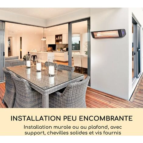 Le radiateur infrarouge blumfeldt Smartwave se monte facilement au mur et n’encombre donc pas le passage, en chauffant rapidement et efficacement d’en haut avec une puissance de 2400 watts. Grâce à la technologie infrarouge, la chaleur est ciblée sur les personnes qui se trouvent à proximité du chauffage au lieu de simplement réchauffer l’air ambiant. Avec la télécommande pratique, il est possible de régler le thermostat numérique en quelques secondes à une température comprise entre 5 et 45 °C, en fonction de vos besoins, par exemple, pour éviter le gel en hiver ou pour procurer une agréable chaleur lors des soirées plus fraîches. Organisez des soirées, des fêtes dans le jardin ou dans un garage sans vous soucier de la température, car en basculant simplement l’interrupteur, une chaleur agréable et douillette se fera instantanément ressentir sans préchauffage nécessaire. L’effet lumineux des tubes infrarouge en carbone est réduit au minimum afin de ne pas éblouir durant vos soirées. Le capteur corporel est particulièrement pratique car le chauffage se met en route s’il détecte des personnes à proximité et s’éteint lorsque ces dernières se sont éloignées.