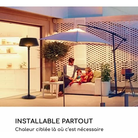 Le radiateur Blumfeldt Venice Heat Stand s’installe n’importe où de façon fiable pour réchauffer rapidement et efficacement vos invités et vous-même avec jusqu’à 2000 watts de puissance. Le système IR ComfortHeat impressionne avec ses deux éléments chauffants infrarouges extrêmement durables. Non seulement ils délivrent la chaleur très rapidement, mais grâce au réflecteur en aluminium très efficace et au rayonnement infrarouge à grandes ondes, il ciblent les personnes et les objets environnants sans réchauffer l’air ambiant. Profitez de sa chaleur agréable dès la première seconde ! En appuyant sur un bouton, vous pouvez choisir entre les deux niveaux de chaleur (1000 ou 2000 watts) en quelques secondes, ce qui vous permet de répondre facilement aux besoins de vos invités. Ne vous souciez plus des températures et prévoyez des dîners sur le balcon ou des fêtes dans le garage, vous pouvez désormais créer une chaleur agréable, simple et sûre dès la mise en marche du parasol chauffant, sans phase de préchauffage. Robuste en aluminium et équipé d’un abat-jour élégant, le radiateur Blumfeldt Venice Heat Stand est non seulement durable mais aussi élégant. Pour une utilisation extérieure en toute sécurité, le boîtier est protégé contre les éclaboussures selon IP34 et s’utilise facilement lors des soirées humides.