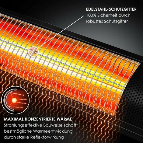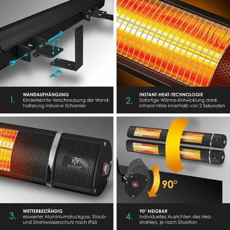 Si vous souhaitez acquérir un chauffage infrarouge moderne, vous avez déjà entendu parler de la technique de chauffage infrarouge innovante et sans entretien. Naturellement, le plus frappant avec les chauffages à infrarouge, c’est la chaleur. Au jardin par exemple, les chauffages diffusent une chaleur extrêmement agréable et garantissent ainsi de longues nuits au jardin ou sur le balcon. Ainsi, même les soirs d’automne et de printemps, vous pouvez encore vous asseoir dehors et savourer des moments entre amis ou en famille. Les chauffages sur pied modernes présentent sans aucun doute de nombreux avantages par rapport aux radiateurs électriques soufflants traditionnels. Puissance comprise entre 1 000 W à 3 000 W, réglable sur 3 niveaux. Installation facile au mur ou au plafond avec un contrôle pratique par télécommande. Avec le radiateur à infrarouge mural performant IR-Gastro-Bar de KESSER, peu encombrant, le soir venu la fête ne fait que commencer. Vous cherchez un radiateur infrarouge pour votre restaurant, votre jardin d’hiver ou pour chauffer votre table à langer ? Voici le radiateur IR-Gastro-Bar ! Vous pouvez accrocher chaque système KESSER IR-Gastro-Bar comme bon vous semble. De plus, l’appareil est facile à utiliser. Vous n’avez même pas besoin de vous approcher directement du radiateur, vous pouvez le contrôler facilement et confortablement avec la télécommande.