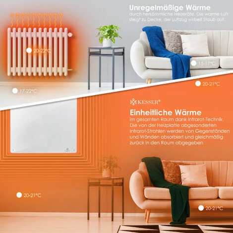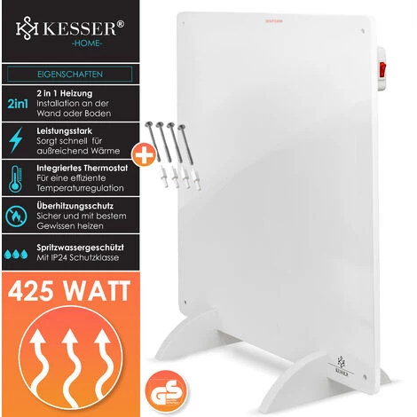 Ce chauffage infrarouge/panneau chauffant à faible consommation et respectueux de l’environnement est extrêmement fin et très facile à installer. Ce radiateur infrarouge a une épaisseur de 1 cm. Même lorsqu’il est monté, il n’est qu’à environ 3 cm du mur. De plus, il peut être peint dans n’importe quelle couleur, ce qui vous permet de l’adapter à l’intérieur de votre maison.Les radiateurs infrarouges sont beaucoup plus efficaces, consomment moins et sont plus écologiques que les radiateurs traditionnels. Ces derniers utilisent de l’air pour transporter la chaleur, en revanche, les radiateurs infrarouges ont le même fonctionnement que le soleil : les ondes de chauffage sont transmises directement à tout élément présent dans la pièce. De cette manière, on économise beaucoup d’énergie. De plus, ce radiateur infrarouge est très facile à installer grâce à ses accessoires de montage. Il est également facile à utiliser et à nettoyer. Détails techniques :Modèle 425 W• Couleur : Blanc• Matériau : céramique• Longueur du câble : 1,5 mDimensions : 60 x 60 x 1 cm• Puissance maximale : 425 W• Puissance nominale : 400 W• Tension/fréquence : AC 220~240 V, 50/60 Hz• Température de surface : 70°C~95°C• Avec interrupteur On/OFF / Classe de sécurité : IP 24• Un thermostat intégré pour maintenir la température maximale (environ 95°C)• Protection contre la surchauffe• Peut être peint• Radiateur mural• SC (sécurité contrôlée)Modèle 550 W• Couleur : Blanc• Matériau : céramique• Longueur du câble : 1,5 mDimensions : 80 x 60 x 1 cm• Puissance maximale : 550 W• Puissance nominale : 500 W• Tension/fréquence : AC 220~240 V, 50/60 Hz• Température de surface : 70°C~95°C• Avec interrupteur On/OFF / Classe de sécurité : IP 24• Un thermostat intégré pour maintenir la température maximale (environ 95°C)• Protection contre la surchauffe• Peut être peint• Radiateur mural• SC (sécurité contrôlée)
