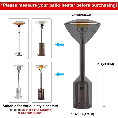 【Couverture extérieure de qualité supérieure】Taille de la couverture du chauffe-terrasse : 95″ H (241 cm) x 34″ DIA (86 cm) x 18,5″ DIA (47 cm), s’adapte à la plupart des chauffe-terrasses standard. Veuillez mesurer votre chauffe-terrasse avant d’acheter.
