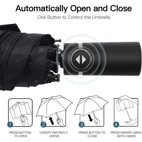 Spécialement conçu, le parapluie double de ce parapluie s’ouvre et se ferme d’une simple pression sur un bouton. Appuyez sur le bouton pour l’allumer, puis appuyez à nouveau dessus pour l’éteindre. Avec la verrière fermée, tirez manuellement le cadre vers la position verrouillée. Une fois le parapluie rangé dans son socle, son mécanisme d’ouverture automatique peut être à nouveau utilisé.